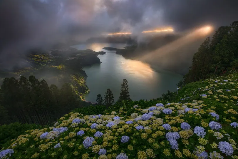 夏季,整个岛屿都开满了漫山遍野,五颜六色的野生绣球花。清晨我来到山顶,一缕光线透过云层射向远方的火山湖,如此静谧而又热烈。这里的一切都太美了!