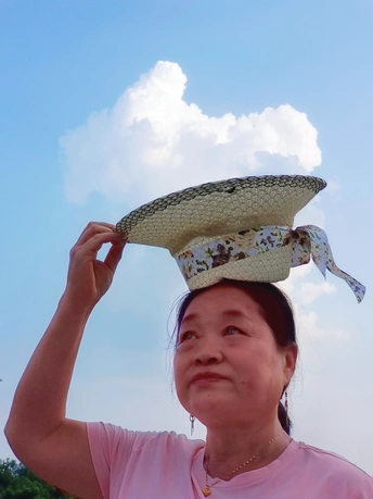2025年7月7日 错位拍摄于湖北省武汉市洪山区狮子山天桥。没有云彩时,帽子遮阳,云彩飘来头顶时,用帽子反过来收集当云空间储存数据。