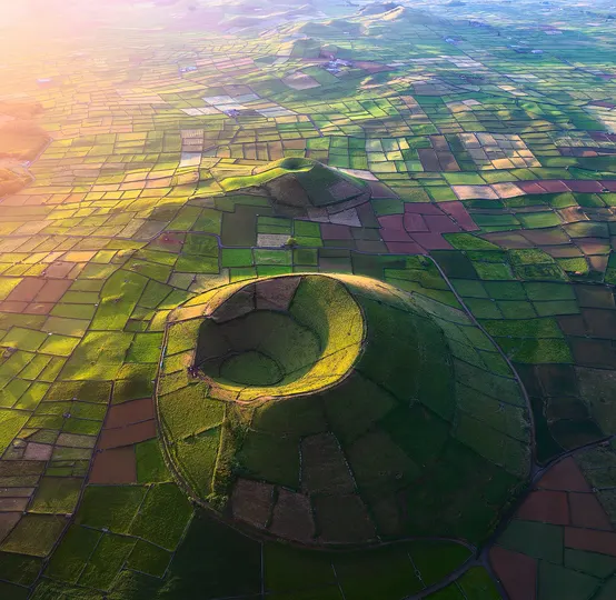 在广袤的滨海平原,散落着数座火山口。格子状的绿色地貌是当地牧民的草场,在清晨的光影下起伏的地貌如梦似幻。拍了那么多黑不溜秋光秃秃的火山口,这里的绝对是独一无二的