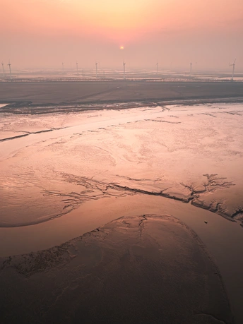 航拍视角下,滩涂在落日余晖里晕染成温柔橘色,潮汐蚀刻的纹理如大地脉络。远处,风力发电机列队而立,工业风与自然景相融,落日为幕,谱写出一首传统与现代交织的生态乐章,静谧又充满力量 。