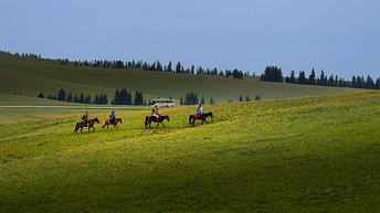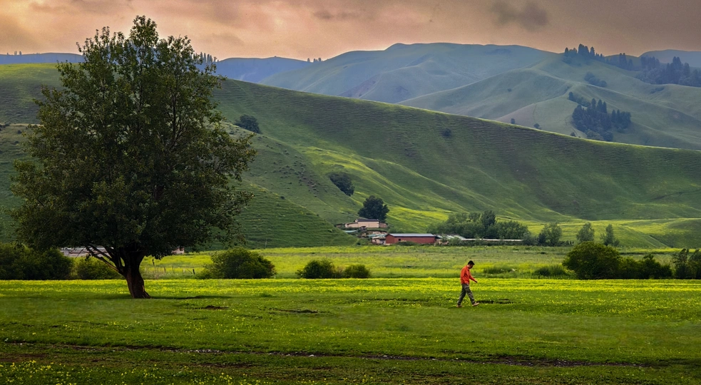 来到那拉提大草原,被眼前景色所振撼,仿佛来到了童话般的世界。那拉提大草原位于新疆伊犁河谷,水草丰美,被誉为"空中草原"。夏季绿浪翻滚,野花遍野;冬季银装素裹,宛如仙境。哈萨克牧民的毡房点缀其间,牛羊成群,构成一幅壮丽的塞外画卷。