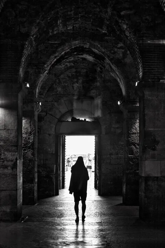 黑白交织的光影低语,在寂静的石廊间层层叠叠,沉淀下岁月独有的重量。这背影承载的,不止是一段物理的穿行,更像一场跨越时空的精神跋涉,走向可能的光明,探寻隐秘的回响。