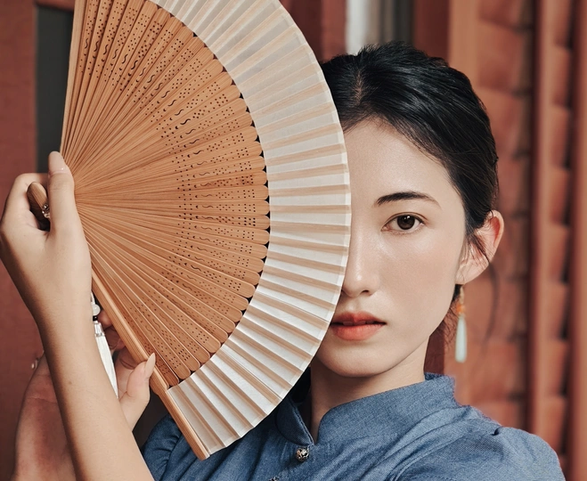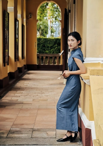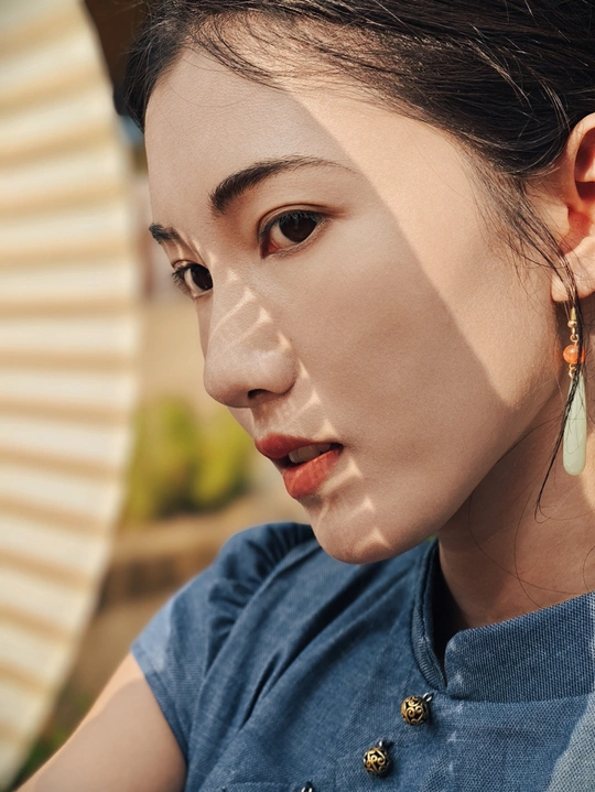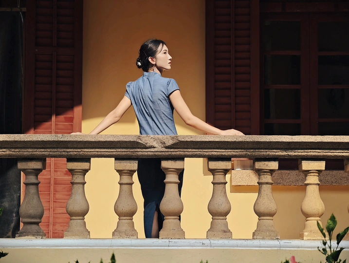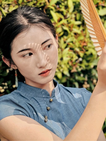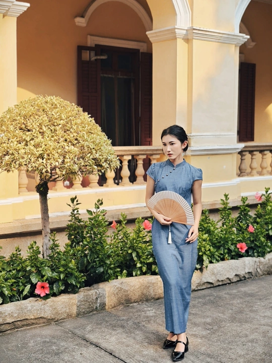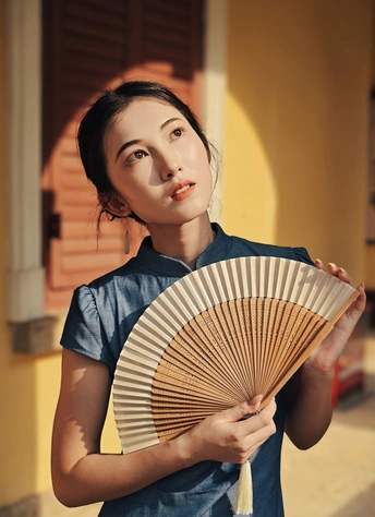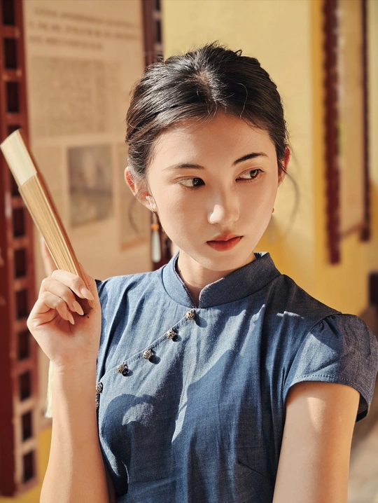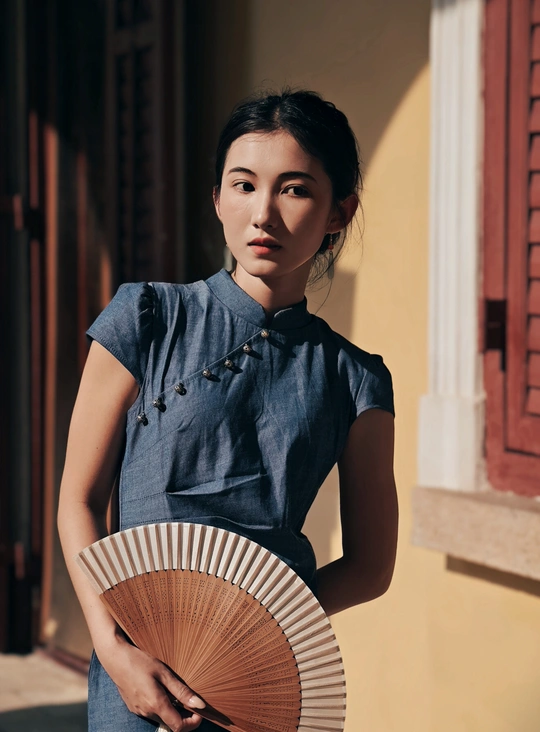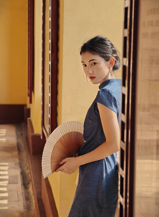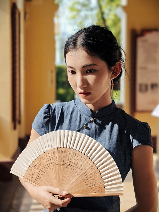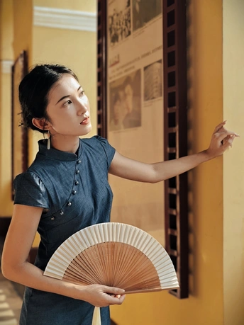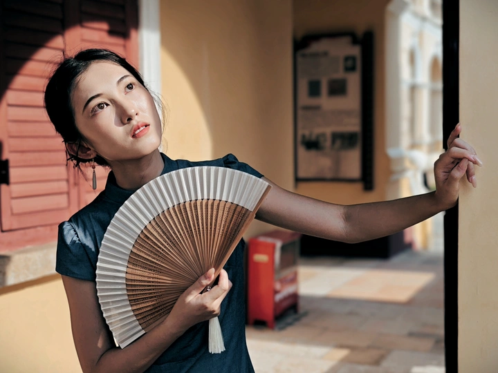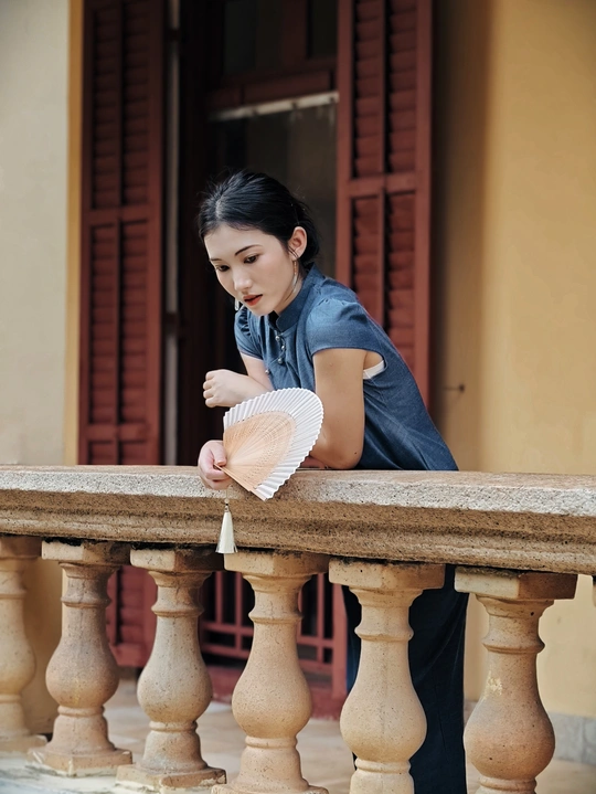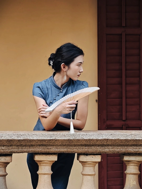 一袭靛蓝旗袍,轻摇竹木团扇,在复古建筑的光影里,把民国旧梦,缓缓晕染 。
