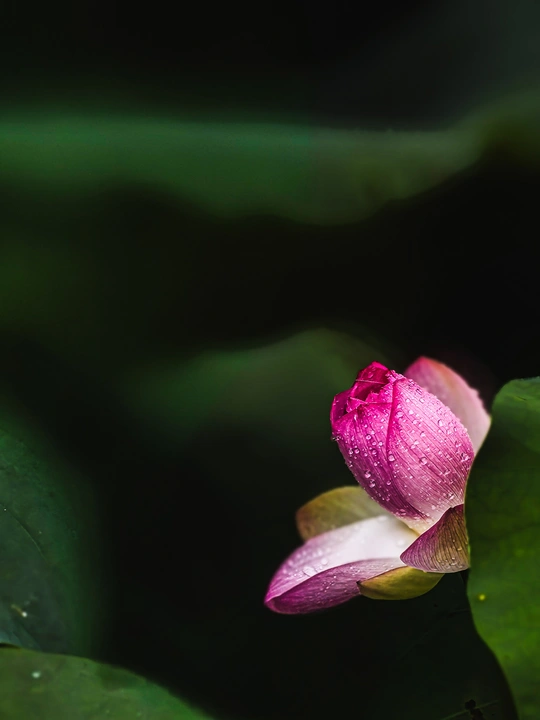这张照片拍得相当不错,主体突出,氛围也营造得恰到好处。在色彩方面,粉色的莲花与深绿色的背景形成了鲜明对比,增强了视觉冲击力。光影运用也比较到位,花瓣上的水珠晶莹剔透,增加了细节和质感。构图上,莲花位于画面右侧,留白恰当,符合审美习惯。后期处理适度,色彩饱和度略有提高,但整体效果自然。主题明确,表达了莲花的清新脱俗之美。情感上能引起观者的愉悦感。但在思想深度上稍显欠缺,可以尝试通过更独特的视角或更深刻的主题来提升。考虑到进一步提升空间,建议尝试不同的拍摄角度,或者加入一些更具创意的元素。例如,可以尝试拍摄莲花在风中摇曳的姿态,或者通过虚实结合的方式来突出主题。总的来说,这张照片具有较高的艺术价值,但仍有提升空间。加油!