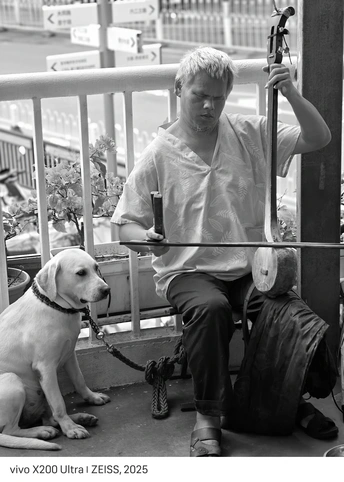大叔在街头专注演奏,身旁的狗狗安静陪伴,黑白光影里藏着说不出的温暖。他们或许在无声交流,却让路过的人都感受到了治愈。