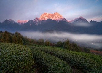 初春雪后,峨眉山似刚从银装素裹中苏醒。雪在峰巅残留,为巍峨山姿添几分清冷。阳光穿透薄雾,洒在雪与岩石交映的山体,明暗相衬,雄浑又神秘。前景茶树初绽新芽,嫩绿小巧,在微寒里透着生机,与远处雪色山峦呼应,自然的刚柔、新旧交替之美,尽融这一幅山水茶景中。
