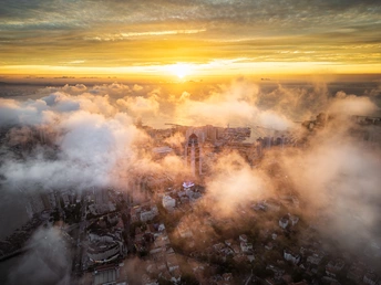 起飞无人机,我拍下了平流雾下的火烧云青岛老城区!