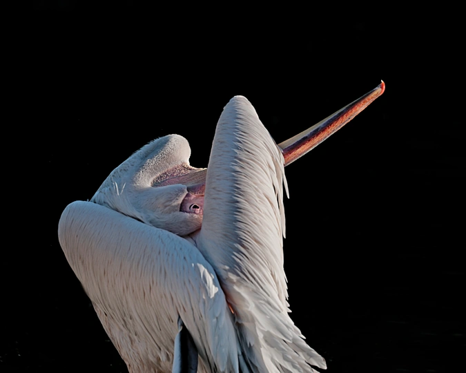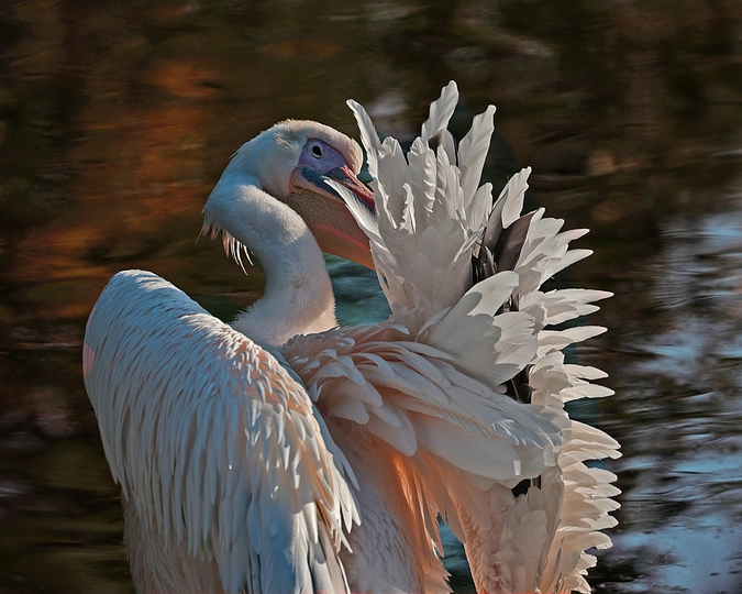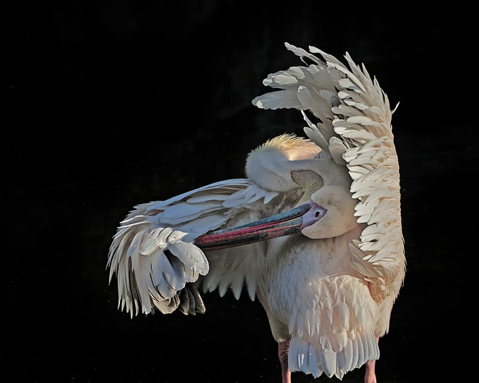 摄于:2024年10月北京动物园,鹈鹕在湖中央阳光洒落在它光洁的羽翼上,泛出珍珠般温润的光泽,仿佛整片湖水都化作镜面,只为映出它的倒影。它时而低头梳理羽毛,长颈弯成一道优雅的弧,涟漪便一圈圈漾开,像为它铺展的银白裙裾;时而静止不动,任风掠过湖面,吹皱的波光便成了它裙角细碎的蕾丝。天地间忽然安静下来,只有它独自在澄澈的碧琉璃上,完成一场无人惊扰的疏妆。富士中画幅相机GFX100s,镜头100-400mm加1.4增距镜。