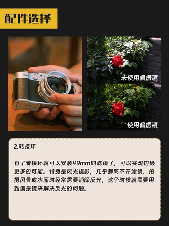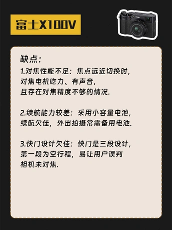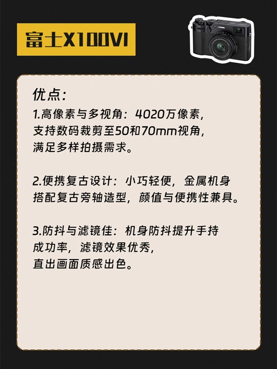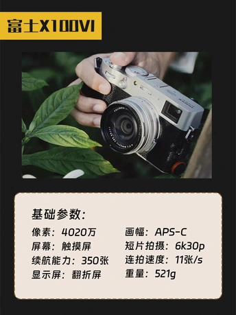 富士相机向来是复古风的代表,富士X100VI更是不少摄影爱好者的心头好。复古的机身搭配经典旁轴取景器,复古韵味拉满。如果你正打算入手这款相机,这篇笔记可别错过,总结了基础参数、优缺点及配件选择,感兴趣的话一起看下去吧。 基础参数: 像素:4020万 屏幕:触摸屏 续航能力:350张 显示屏:翻折屏 画幅:APS-C 短片拍摄:4k30p 连拍速度:11张/s 重量:471g 优点: 富士X100VI搭载23mmF2固定焦距镜头,图像质量和细节表现十分出色,色彩还原真实,动态范围优秀,适配多种摄影风格。 小巧便携:作为一款便携性很强的相机,轻便的机身很适合旅行、街拍和日常记录。 外观设计借鉴了经典相机,机械感与复古风兼具。控制布局和手动操作环设计贴心,能让摄影师更好地手动掌控拍摄。 缺点: 配备固定焦距镜头,虽光圈大、图像质量高,但对于需要变焦的场景,可能得额外考虑其他相机。 相较于可更换镜头系统的相机,镜头选择较少,无法根据拍摄需求更换不同焦距或特殊用途的镜头。 电池续航不算长,外出拍摄得多备块电池。 配件选择: 遮光罩是必备配件,安装在镜