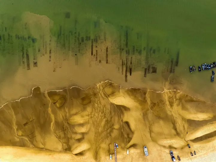 高空拍摄的滩涂与海,犹如一幅写意漫画,勾勒出了特殊的色彩意境,给人留下了广大的想象空间。