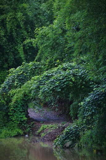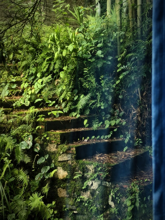 在城郊的晨昏褶皱里,我与这两幅「自然残简」不期而遇。 那阶被苔痕啃噬的石阶(第一张),原是人造的规整,却在岁月潮汐里,成了植物拓印生命的画布。蕨类以古老的姿态攀爬,青苔如墨汁洇染石肌——人类筑造的「实用符号」,终被自然解构为「生长的容器」,像一场缓慢的、关于「占有与归还」的仪式,让我看见文明在荒野面前,永远是未写完的注脚。 而水边那道藤蔓垂落的径(第二张),是自然写给人间的「绿色密信」。藤蔓织就的穹顶,滤掉了城市的轰鸣,只漏下碎银般的日光。站在堤岸时,竹叶与水波的絮语,像天地在说悄悄话——原来最动人的叙事,从不需要人声鼎沸,只需一片愿意「吞噬喧嚣」的绿野,和一颗肯于「聆听沉默」的心。 这些画面,是自然对「人类遗迹」的温柔篡改,也是荒野向「都市访客」递出的和解信笺。它们让我懂得:所谓「高级的故事」,从不是刻意编排的情节,而是当人造秩序与自然野性碰撞时,那些「失控」里生长出的、超越语言的生命诗行。