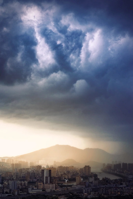 乌云在天际翻涌,如墨汁泼洒的巨幅画幕,却在褶皱间悄然绽开裂隙——金缕似的天光奋力穿透云絮,如神祗垂落的丝带,泼洒向人间。 城市的楼宇错落成沉默的剪影,在明暗交界处勾勒硬朗轮廓,仿佛被时光按下静音键。远处山峦原隐于灰蒙,此刻被那缕光轻轻晕染,黛色峰脊漫出暖黄光晕,恰似大自然在阴沉画布上添的温柔注脚。 这画面是一场无声协奏:乌云的沉郁与天光的明丽共振,城市的烟火与山川的静穆和鸣。风雨欲来的压迫里,藏着破云而出的希望,叫人屏息凝视——原来天地的诗意,正藏在这明暗交织的刹那间。