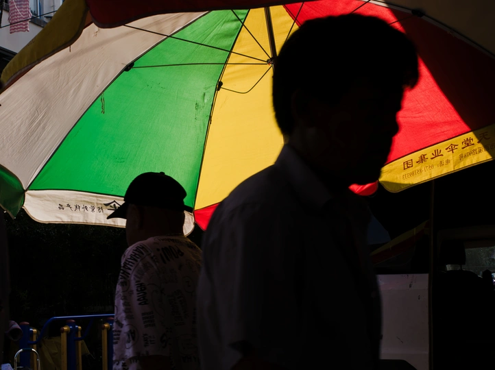 火辣辣的骄阳砸在彩虹伞上,像打翻的果酱。伞下的人只剩一道剪影。世界热到融化,伞底却是一片浮动的清凉。