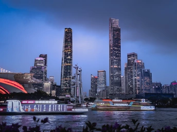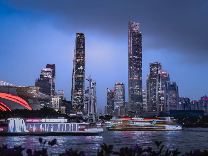 珠江水面如同一面巨镜,将城市灯光完美复制,形成上下呼应的视觉奇观,游船划过时更添动态光影。