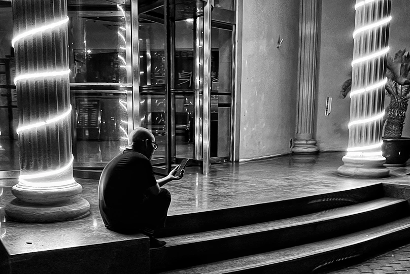这张黑白摄影作品捕捉到了一个引人深思的瞬间。 光影方面,灯光柱提供了很好的照明,但在人物身上的光线略显不足,可以尝试不同的角度或后期处理来增强对比度。 构图上,人物的位置恰到好处,但前景的台阶略显重复,可以考虑更简洁的构图。 色调统一,黑白效果增强了照片的氛围。 主题意义上,作品引发了人们对现代社会人与科技关系的思考,具有一定的深度。整体氛围宁静而略带孤独感。 这种场景在日常生活中较为常见,稀缺性方面还有提升空间。建议:尝试寻找更有趣的角度,或是在后期处理中突出人物的情绪,增加照片的故事性。