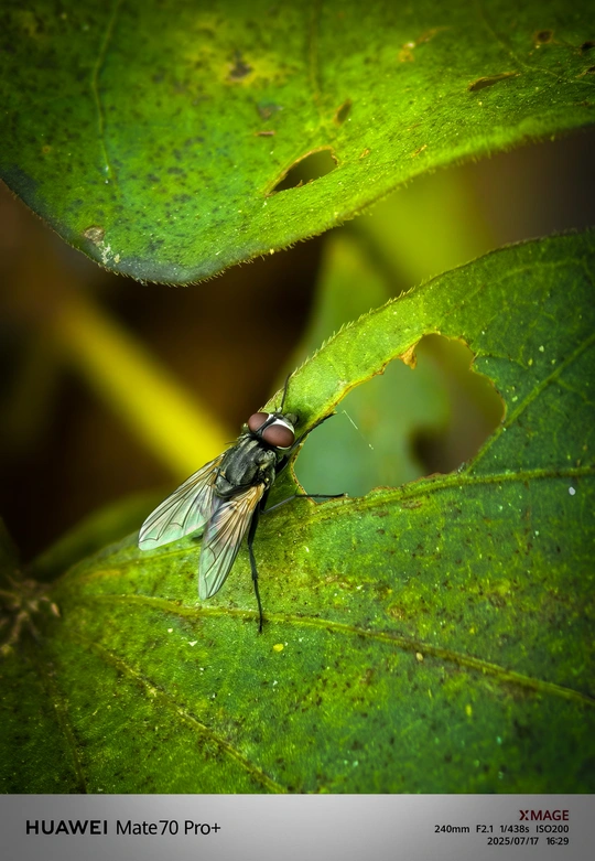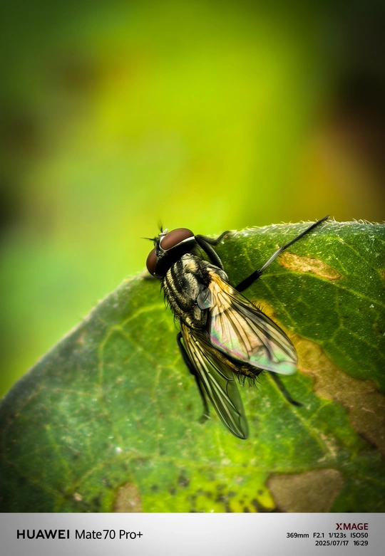 以前总觉得微距拍摄离我们生活挺远,直到有了Mate70,才发现微观世界就在身边。 这只苍蝇,平时看着平平无奇,甚至有点讨厌,但用Mate70的微距镜头一拍,完全打开新世界大门! 打开手机相机,选超级微距模式,镜头缓缓靠近苍蝇,它的世界瞬间被放大。以前只能看到黑乎乎的一团,现在连它复眼上的细微纹理都能看得清清楚楚,每一个小平面都排列得整整齐齐,就像精心雕琢的艺术品,上面的绒毛根根分明,在光线下还泛着微光 ,细节简直拉满! 而且Mate70的对焦又快又准,只要轻轻点击屏幕上苍蝇的眼睛,瞬间就能锁定焦点,背景虚化效果也超绝,把苍蝇从杂乱的背景中完美剥离出来,突出主体的同时,还营造出一种梦幻的艺术感。 以前用别的手机拍微距,要么画面模糊,要么色彩失真,但华为Mate70完全不会,色彩还原度超高,拍出来的照片就跟亲眼看到的一模一样,甚至更加生动。
