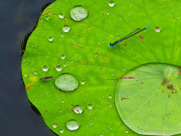 荷叶承雨,水珠如珠玉散落。豆娘与水黾各据一方,似在这方小天地里,共享雨后的清宁。
