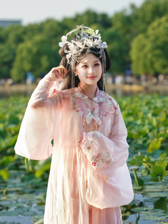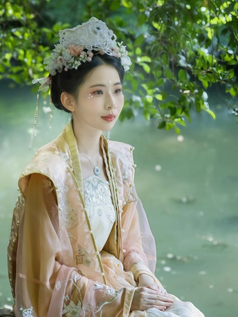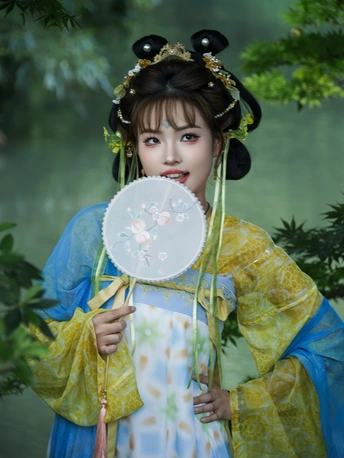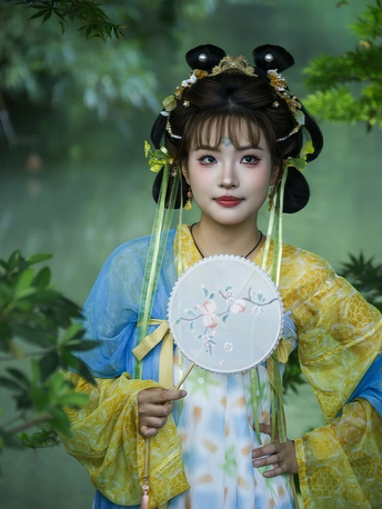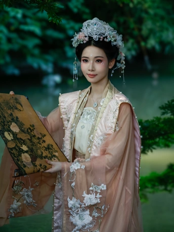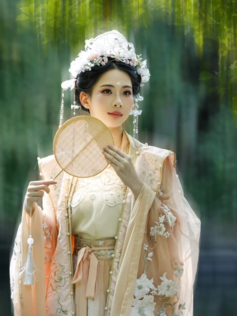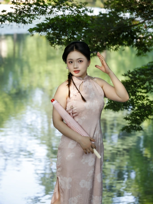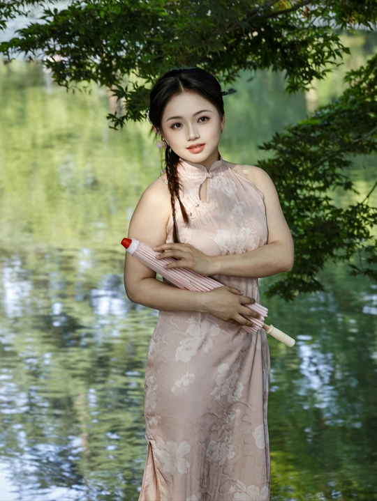在葱郁绿意间,身着华服的女子们,似从旧时光中翩然走来。旗袍勾勒玲珑曲线,古韵流转;汉服裙摆飘逸,尽展清雅之姿。团扇轻摇,摇落满庭芬芳;琵琶斜抱,似要弹奏千年乐章。她们与这方景致相融,每一处细节都诉说着古典之美,让人沉醉在这穿越时空的浪漫邂逅里。