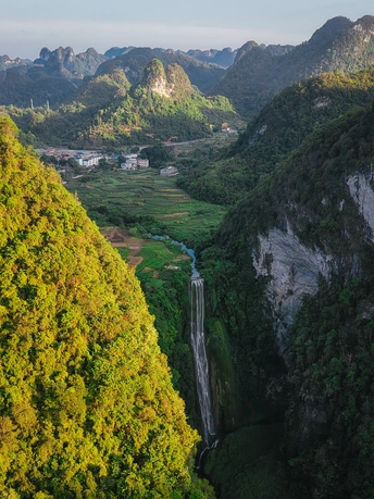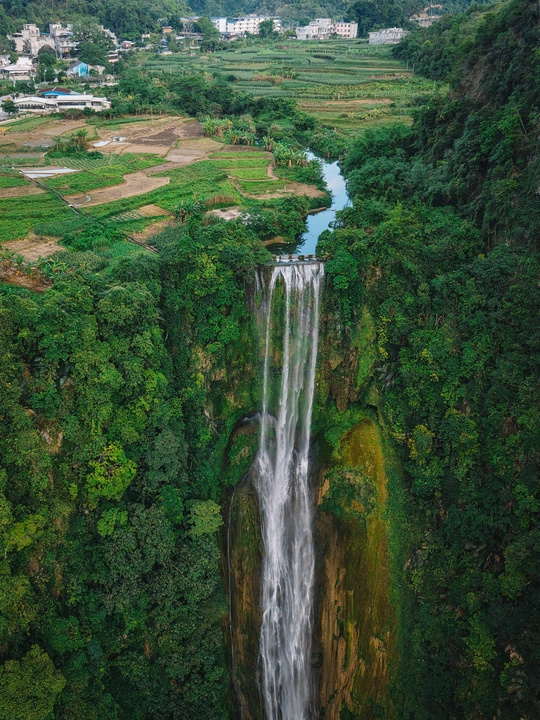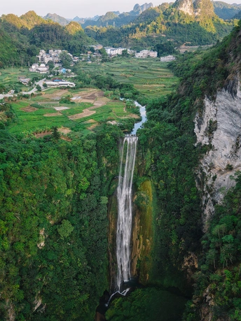 这个视角是在景区门外航拍得到的,瀑布从平地流入地下溶洞,有流入地心的错觉。而进了景区之后就变得普通了,尤其是返程10元大巴特别扣分。