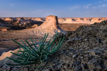 陡峭的岩峰如王冠般隆起,地层如波浪般展开。盐穗木(Anabasis salsa展现出沙漠生命的坚韧。A lone, crown-shaped mesa rises steeply as sedimentary layers ripple outward like waves. In the foreground, succulent desert flora showcases the tenacity of life in arid lands. 盐穗木为西哈萨克斯坦典型的盐生植物,适应干旱与石灰岩裸地,枝茎多肉状。