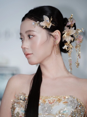 模特头饰、服饰的金色华丽装饰,头上蝴蝶造型饰品,营造出梦幻精致氛围 。