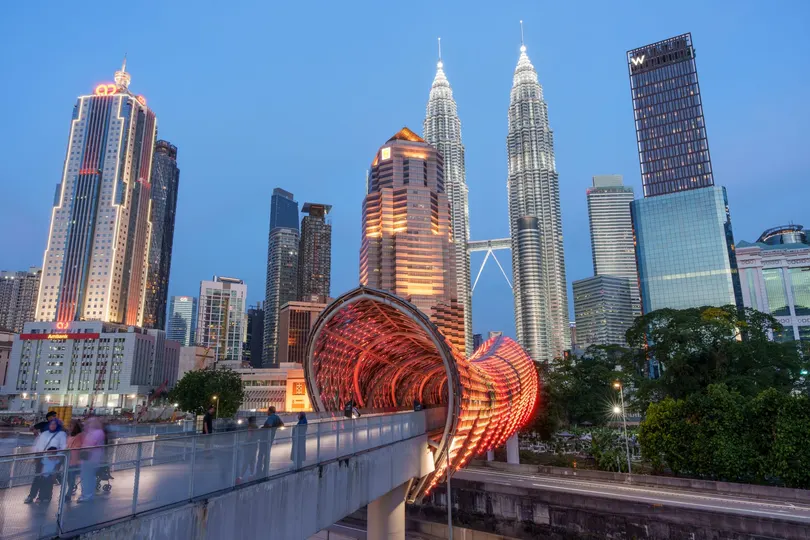 吉隆坡,马来西亚的首都,一座充满活力与魅力的城市,在夕阳余晖褪去后,便迎来了如梦如幻的蓝调时刻。 当夜幕即将降临,整个吉隆坡仿佛被一层蓝色的薄纱所笼罩。城市的天际线在蓝调的映衬下,显得格外迷人,双子塔刺破云端,在蓝色背景下闪耀着璀璨光芒,仿佛诉说着马来西亚的现代传奇。此时的吉隆坡,既有大都市的繁华喧嚣,又在蓝调的渲染下增添了几分宁静与浪漫。