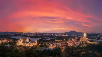作品拍摄于2025年4月20日,华为欧洲小镇旁边的科技园里。 前期工作:在出发拍摄前,我提前三天看好了东莞的晚霞预报,算好了这个能够记录华为欧洲小镇的位置。于是当晚霞出现,欧洲小镇华灯初上,我按下了快门,利用全景接片和曝光合成的手法完成这张照片的拍摄。 后期处理:在后期中,多次给照片进行颜色的处理,将画面统一成具有晚霞氛围感的暖紫色调,同时恢复了地面建筑的曝光从而保证作品影调的统一;同时将晚霞的饱和度适当降低,让画面更耐看。 创作目的:通过未曾被探索的角度来记录华为欧洲小镇的美丽风光 这张华为晚霞不仅是一张风光摄影作品,它更加展示了华为欧洲小镇美丽的一面,华为进入条件苛刻,周围信号干扰强,就算是无人机也鲜有机会记录这样的画面;当神秘的欧洲小镇用照片解开它的面纱,一切都是这么的美好。