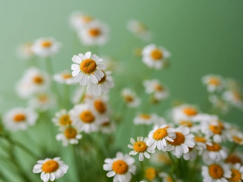 屋内,那抹清新的绿色背景前,洋甘菊肆意绽放,洁白的花瓣簇拥着暖黄的花蕊,微风拂过,淡淡的清香弥漫开来,似是把夏日的温柔都揉进了这一方小天地里,驱散了心头的燥热与烦闷。