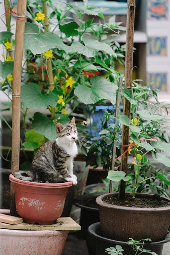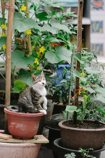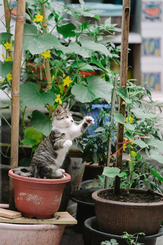 小猫看到一只大蜜蜂,很好奇,还好没被蜇到