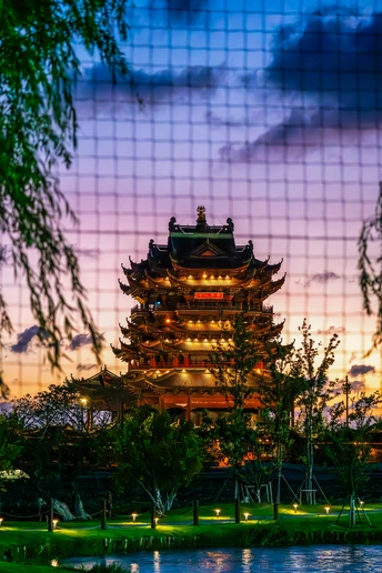 暮色漫染,层云渐舒,古楼檐角轻挑,灯火次第亮起。晚风拂柳,掠过低垂的丝绦,将千年的故事,揉进这一帘温柔的黄昏。