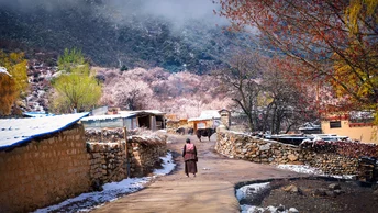 四月的西藏尼屋乡,春光悄然降临。粉色桃花沿山绽放,嫩绿柳枝在雪后苏醒。藏族妇人缓步走在清晨的村道上,道旁石墙上还残留着昨夜的积雪。牛悠闲地站在前方,狗躲在屋角,构成一幅安静温暖的高原春日图卷。雪未融尽,春意已浓,这是大自然最柔和的告白。