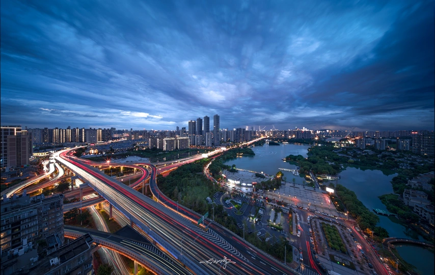 受台风“韦帕”影响,长沙在雷暴强对流的天气下,我登上楼顶拍到了远处的闪电与立交的交汇