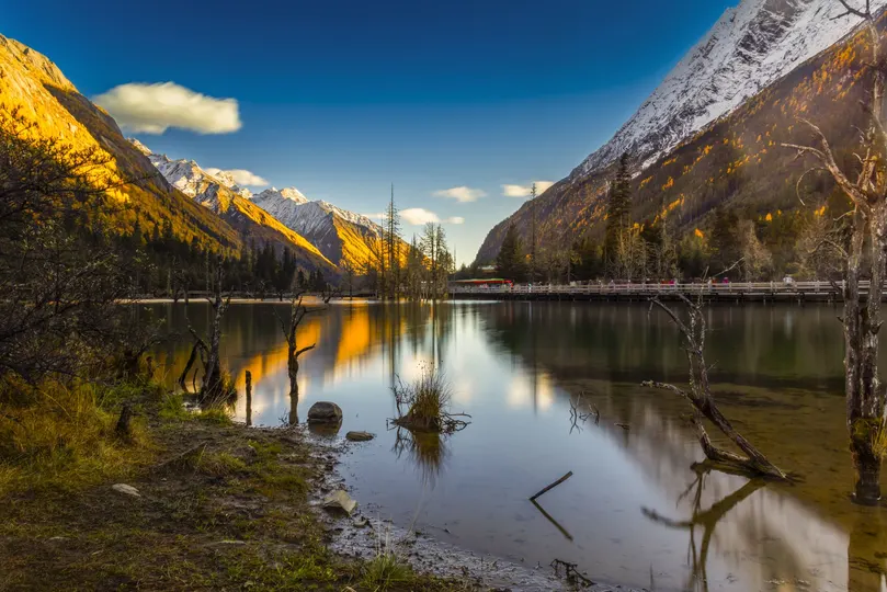 此拍拍摄于川西四姑娘山景区,用慢门拍下了这张雪山和蓝天白云倒映在水中的景色。