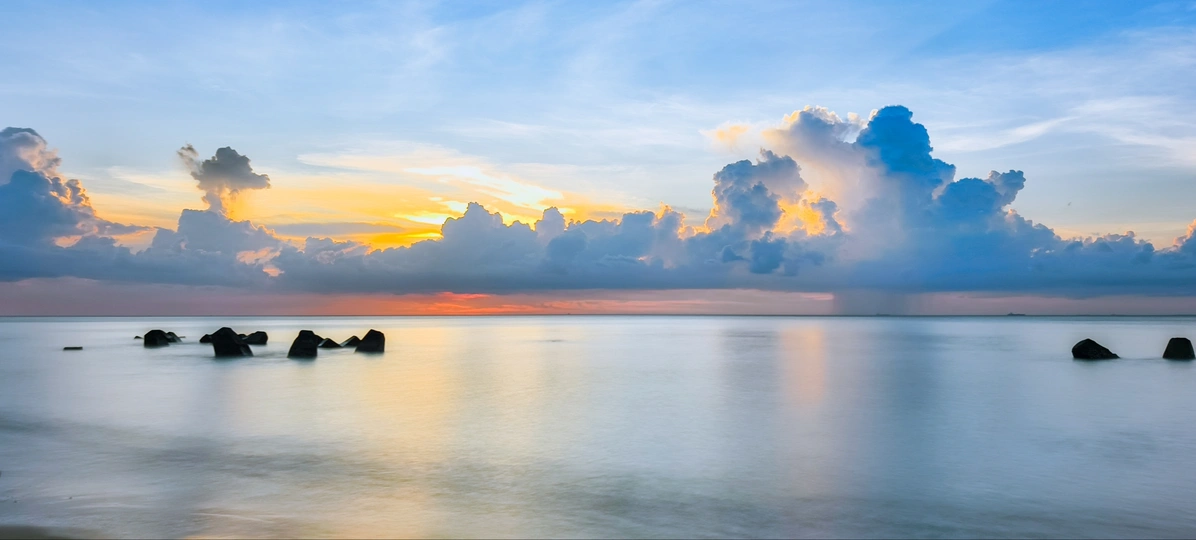 夏日海边的日落时分,云霞似彩墨泼洒,从橙金到淡紫的渐变,为天空晕染出梦幻层次。海浪轻拍着沙滩,日落让海面泛起金波,利用时光慢门,把海面拍出了镜面的感觉。