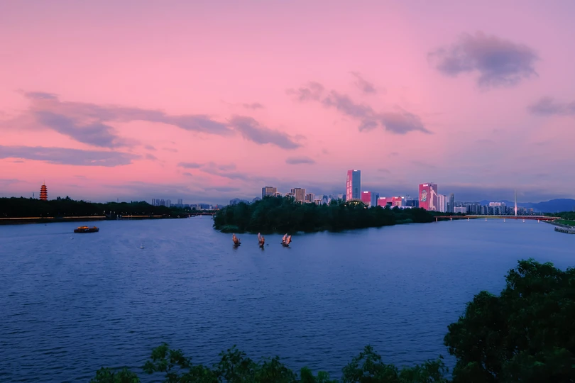 夏日浪漫霞光下的新城华灯初上