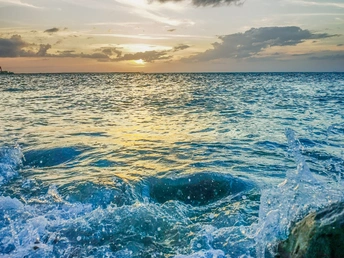 浪花翻涌、落日余晖,海水蓝与落日金、天空橙紫交融,冷暖色调碰撞,既显大海深邃,又有黄昏浪漫。