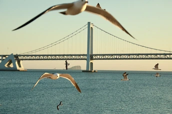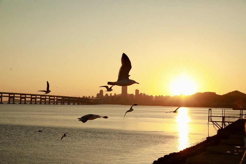 滨海之城,于我而言,是光与影交织的梦。初遇时,我便被那座跨海大桥吸引,它似巨龙卧于碧波之上。 第一次拍摄,我满怀期待,却总觉画面缺了灵动。直到海鸥闯入镜头,它们或掠水而飞,或振翅苍穹,瞬间为画面注入灵魂。从此,我常赴海边,静候与它们的邂逅。 清晨,阳光轻柔洒落,给大桥与海鸥镀上金边。它们成群飞舞,时而叼鱼,时而欢鸣。我屏息按下快门,将美好定格。 黄昏,夕阳染红天际,大桥轮廓分明。海鸥化作金色剪影,如梦似幻。一只海鸥朝我飞来,翅膀在余晖中闪光,我果断抓拍,那成了我最得意的作品。 日子流转,我拍了无数滨海与海鸥的照片。它们见证了城市四季,也记录了我的成长。每一次快门,都是与这座城、这些精灵的对话。 如今,翻看照片,滨海的模样在记忆中愈发清晰。那桥、那鸥,是我心中不灭的光。摄影于我,不止是记录,更是对美好的追寻与表达。