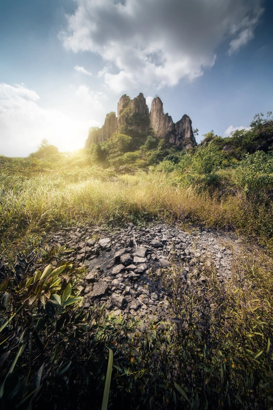 这是一张户外自然风景照片,展现了典型的喀斯特地貌景观。画面中有造型独特的峰林,周围植被覆盖,阳光洒落营造出温暖氛围,近处可见石块与草地,整体呈现出自然原始的生态美感,可能是在具有喀斯特地貌特征的地区拍摄,这类地貌因流水溶蚀等作用形成,常展现出奇特的岩石形态与丰富自然景观