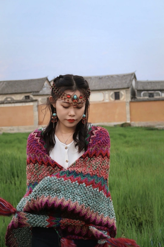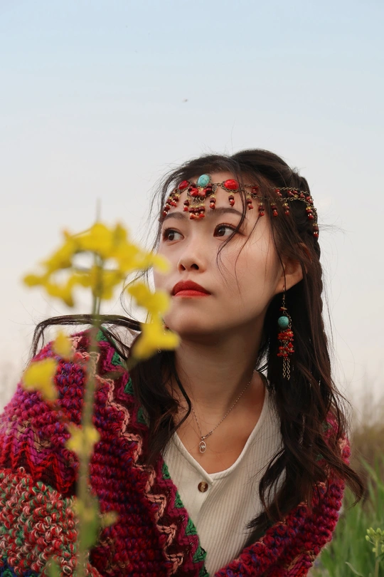 头戴镶嵌红蓝宝石的华丽发饰,耳畔垂落精致长耳环,妆容典雅,红唇夺目。她身着白色内搭,外披一件色彩绚丽的针织披肩,纹理独特,流苏随风轻摆,尽显民族风情。她侧首凝望斜上方,神情沉静,仿佛沉浸在自然与文化的交融之中。 背景是淡蓝天空与朦胧绿野,柔和的光线为画面增添一丝梦幻感。身旁一枝黄花点缀,更添生机。 整体构图和谐,色彩对比鲜明——红与白、蓝与绿碰撞出浓郁的艺术气息,既展现了传统手工艺的精美,又传递出宁静悠远的意境,宛如一幅行走的民族风画卷。