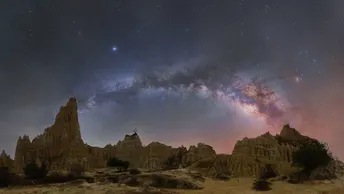 在浪巴铺土林的暗夜画布上,银河以拱桥之姿凌空舒展,与千万年风雨雕琢的土林奇观完成了一场跨越时空的对话。 土林的峰丛如大地凝固的浪涛,孤塔擎天、残垣斑驳,在星光下勾勒出粗犷的剪影——那些被岁月啃噬出的沟壑与棱线,藏着百万年地质变迁的密码。而银河自天顶倾泻,银心区星云晕染出粉紫与靛蓝的层次,与地平线暖红的天光交融,仿佛宇宙将最璀璨的颜料泼向荒原。 当土林的苍凉孤寂遇上星河的磅礴浩瀚,瞬间与永恒在此刻重叠:每一粒星光都见证过土林的风化剥蚀,每一道土棱都承载着宇宙的沉默运转。这是大地史诗与星空神话的共鸣,是自然以“鬼斧神工”写就的双重奇迹——在浪巴铺的夜幕下,我们撞见了时间的形状,也读懂了天地共生的浪漫。