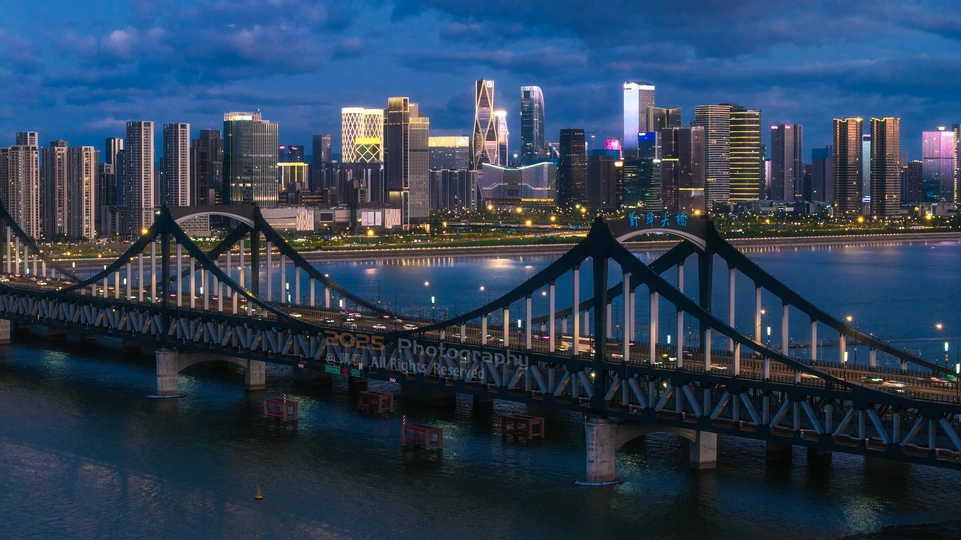 在蓝调时刻由大疆Mavic4pro2.5倍中长焦镜头拍摄 焦段70mm,光圈F2.8,快门1/15s,ISO500,曝光补偿-0.3