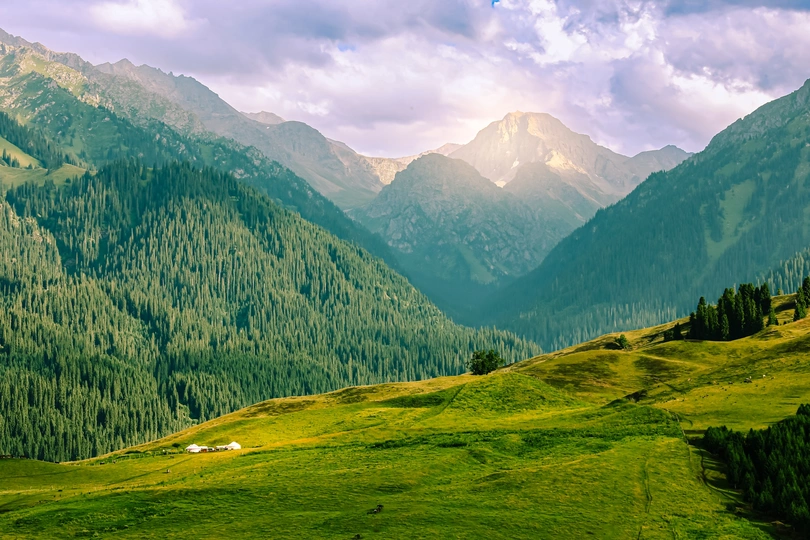 画面中展现了恰西草原一幅美不胜收的山间景致。远处,连绵起伏的山脉巍峨耸立,有的山峰在云雾的缭绕下若隐若现,阳光穿透云层洒在山巅,闪耀着金色的光芒。山脉之间,是一片郁郁葱葱的茂密森林,树木犹如绿色的海洋,层层叠叠,充满生机。近处,是一片开阔而平坦的绿色草甸,草色青青,鲜嫩欲滴,几顶白色的毡房点缀其间,为画面增添了几分灵动与生活气息。整个画面色彩浓郁且和谐,展现出大自然的宁静与壮美。