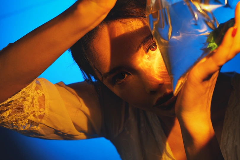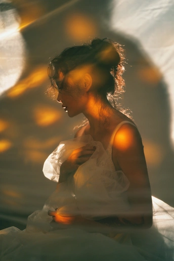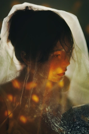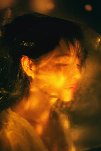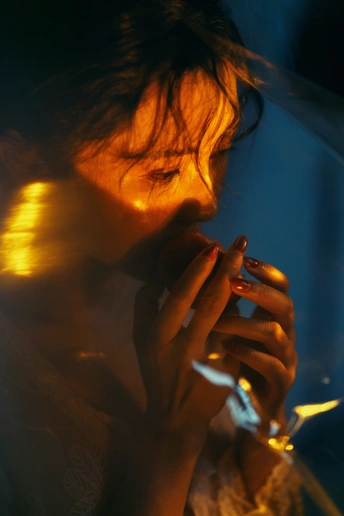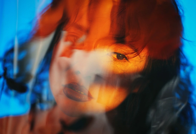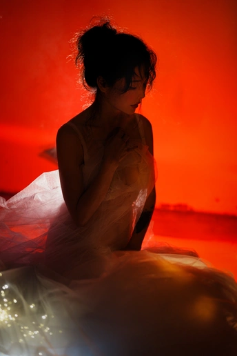 冷月浸染的薄雾,凝于她微启的唇。 暖潮暗涌,在脊背游走如熔金。 冰蓝与橙红,在肌肤上低语、晕染, 织就一场半醒的薄釉之梦。 指尖触碰的,是体温,还是半融的星群?