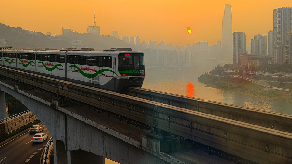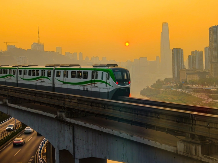 夕阳西下,余晖如金,轻柔地洒落在嘉陵江的江面上,泛起粼粼波光。一列轻轨列车宛如灵动的游龙行驶在跨江的桥上,带着城市的节奏与活力。远处,高楼林立,在落日的晕染下,轮廓变得柔和而朦胧。城市的喧嚣被暮色所包容,只留下一幅静谧又诗意的城市江景图,诉说着这座城市独有的浪漫与韵味。