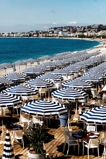 蓝白条纹的伞阵,在晴空下舒展,如同琴键,盛满阳光。木色露台将慵懒摊开,白椅轻摇,似在低语。视线穿过伞的涟漪,海在远处泊成一方澄澈,粼光微闪。更远处,白房子依山层叠,融进天际。蓝与白交响,织就一帧明净无垠的地中海夏日,时光在此地打了个盹,风里便都是悠闲的形状。