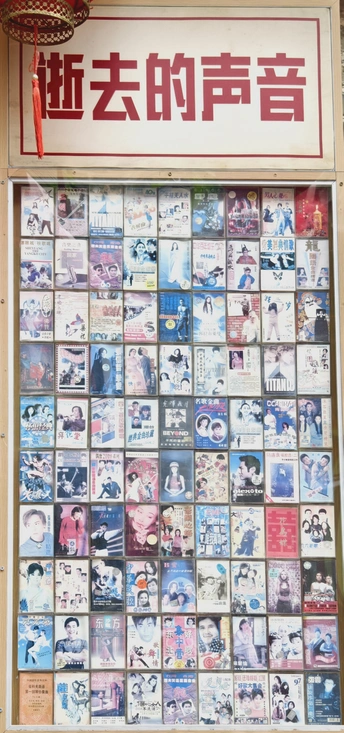 这是在保定旅游时拍下的在一个门市外面墙上里面装满了各种画面的磁带,磁带作为主流音乐存储介质主要流行于20世纪60年代至90年代。