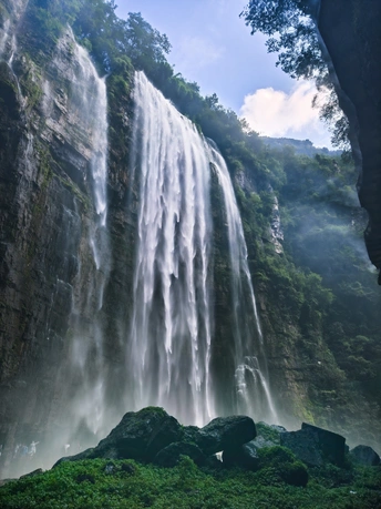 千丈银练自天开,撞碎琼瑶落碧苔。青山如黛裁云处,瀑声漫作太古雷 。