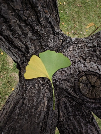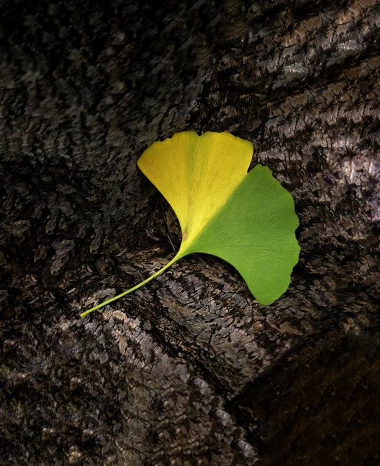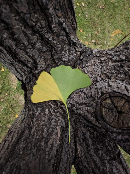 在岁月的纹理之上,一片银杏叶静静栖息。它一半是夏的葱茏绿意,一半是秋的绚烂金黄,仿佛是时光写下的诗行,诉说着季节的交替与生命的流转。于斑驳的树皮背景中,这枚叶子宛如灵动的音符,奏响自然的乐章,让人在这方寸之间,窥见岁月的温柔与奇妙
