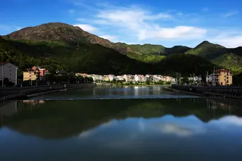 这幅照片展现了乡村山水交融的静美画卷。澄澈蓝天为底,远山如黛,葱郁植被覆于山体,层次分明。山脚下,错落的民居色彩柔和,临河而建。河水似镜,揽尽天光云影、建筑山峦,静谧又清朗。阳光洒落,给画面添了几分明亮,勾勒出乡村独有的悠然气韵,尽显自然与人文相融的和谐景致,让人仿若能嗅到山间清新、听见水流轻响 。