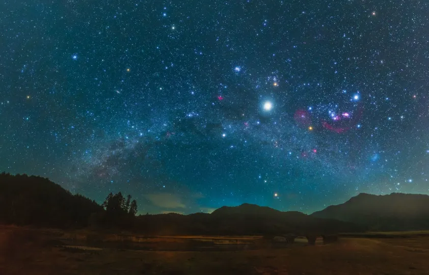冬夜古桥与银河共舞。明清砖石剪影卧于河床,与冬季银河的低悬光带相映,织就人文与宇宙的对话。 夜空里,天狼星如钻夺目,参宿四橙红似炬,旁伴M42猎户座星云的粉紫雾霭,串联起“冬季大三角”的冷峻骨架——这是银河系边缘区的独特景致,亮星主导,星云点缀。 古桥孔洞如眸,望穿星芒;砖石纹理呼应星云湍流。婺源的暗夜让星芒落桥,让数百年人间烟火,成为百亿年宇宙史诗的温柔注脚。